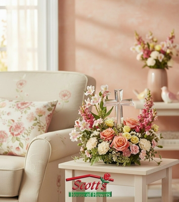 Celebrate faith and renewal with Teleflora's Grace & Glory Bouquet, featuring soft coral roses, pink alstroemeria, and delicate blooms surrounding a radiant crystal cross-an inspiring symbol of peace and everlasting love.